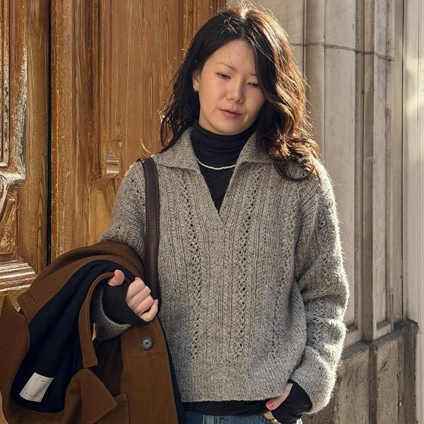Стильный вязаный свитер-поло спицами с выразительной текстурой и современной посадкой. Модель сочетает в себе элегантность классического воротника поло и уют вязаного изделия.